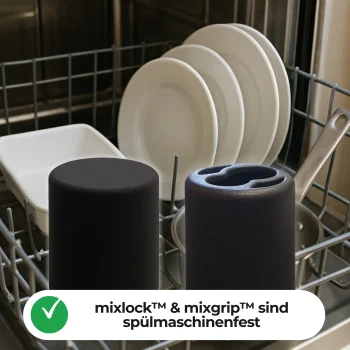 mixlock™ und mixgrip™ bestehen aus langlebigem, hochwertigem Material, sind hitzebeständig und spülmaschinengeeignet. Entwickelt für eine präzise und sichere Passform.